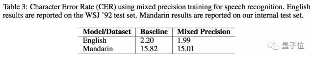 他们用这种方法来训练了DeepSpeech 2模型,进行语音识别。在使用同样模型架构和超参数的情况下,混合精度模型在英语和普通话数据集上,都达到了与FP32模型同样的准确率。