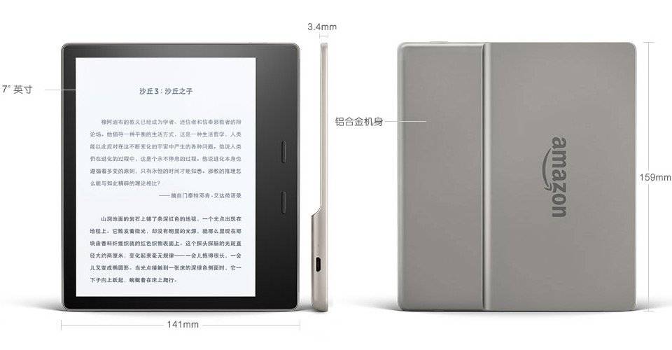 物理设计上,阶梯式的形态符合人体工程学设计,最薄处仅有3.4mm,最厚处也不过8.3mm,铝合金材质的背部使得新品重量大大增加,达到了194g,即使如此,Kindle Oasis依旧轻薄。铝制背部,比采用柔软触感塑料的Kindles更加优质外观和感觉。