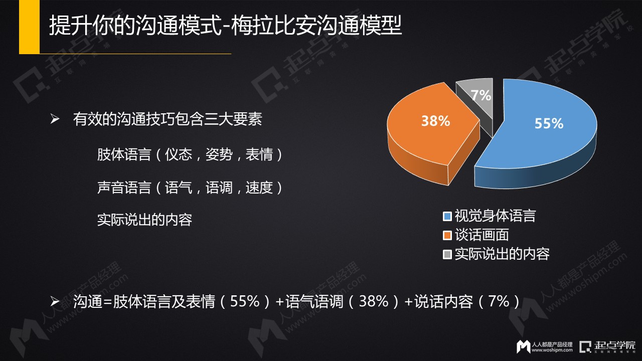 我们理解一个人说的东西,首先是肢体语言——你的仪态姿势和表情可能已经占了一半;接下来才是你的语气、语调和速度,说明了剩下一半中的一大部分;而真正你说的语义:你说的是什么内容?可能是占了最后一个小的部分。
