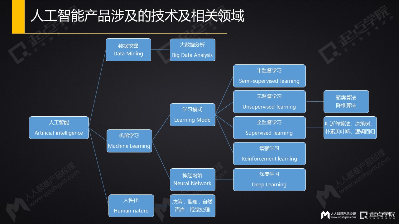 我们前面看了很多很感性的东西,这些都是最后由AI形成的结果。但是在你进入AI领域后,你会面临这样的局面:AI谈了很多,有数据挖掘(我们听得最多的是大数据,数据分析等等),有机器学习(有不同的学习模型,什么半监督、无监督学习、监督学习、增强学习、深度学习等,还有后面很多算法;),有人性化的,到底如何做一名AI产品经理?