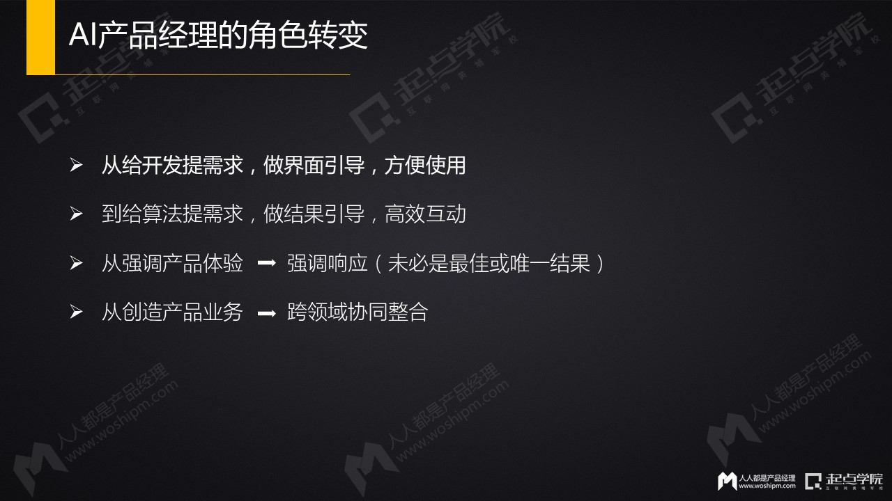 在选完定位以后,作为传统产品经理转人工智能的产品经理,你还要经历一个角色的转变: