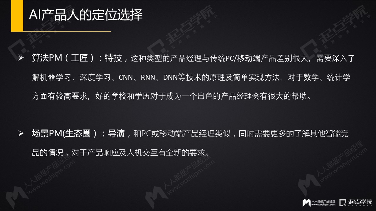 这种类型的产品经理与传统PC/移动端产品差别很大,因为你需要深入了解像机器学习、深度学习这些很专业的术语、逻辑、原理;这些技术原理及实现方法对于数学、统计学方面有较高的要求,如果你有特别好的学校背景与学历,是比较有优势的。