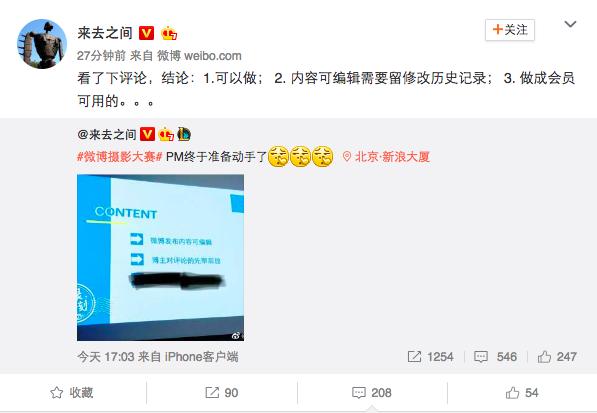 10月12日下午,微博CEO王高飞在微博上(@来去之间)上发布了一条消息“PM终于准备行动了”,重点是消息中配有的一张图片,上面清晰的写着:微博发布内容可编辑;博主对评论的先审后放;以及第三条被打了马赛克(似乎是更为重磅的消息)。虽然并没有说这些功能什么时候推出,但从字里行间可以看出微博是准备开动了。