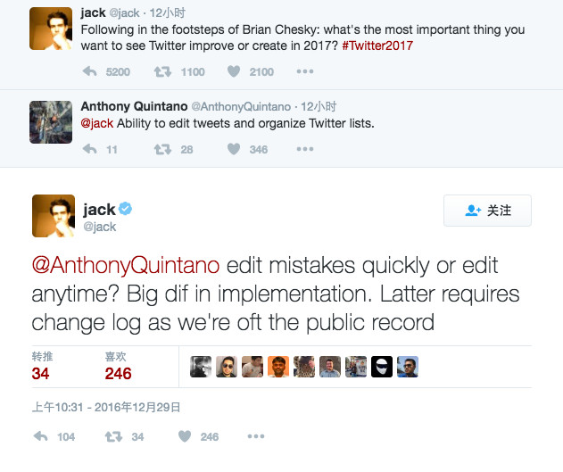 去年12月30日,Twitter CEO Jack Dorsey 发送推文问网友“你最希望明年公司在哪些方面有所提高或创造”,其中一位网友回答称“可以修改推文”。Dorsey随即转发了该推文,并写到“是允许短时间内修改错误,还是任何时候都可以?”