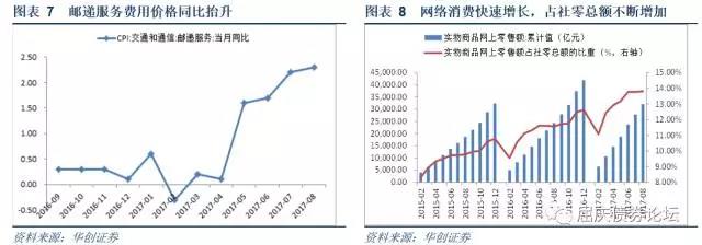 更加值得注意的是,快递提价是上游价格上涨向下游传导的重要环节,特别是网络消费和电商领域。快递价格上涨,一方面直接影响CPI中的邮递服务成本,自2017年以来邮递服务同比快速上涨;另一方面,快递价格上涨将部分向下游消费者传导。