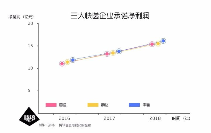 圆通承诺2016年、2017年、2018的净利润分别不低于11亿元、13.3亿元、15.5亿元;韵达的业绩承诺则为11.3亿元、13.6亿元及15.6亿元;申通的承诺业绩为11.7亿元、14亿元和16亿元。