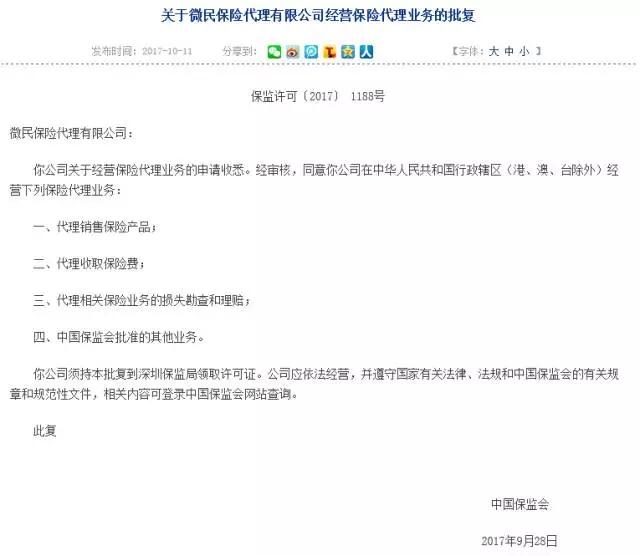 10月11日,保监会官网发文同意批复“微民保险代理有限公司”(以下简称“微保”)经营保险代理业务。资料显示,微保注册资本金高达2亿元人民币,注册地为深圳市,唯一股东为深圳腾富博投资有限公司——腾讯为其控股股东。