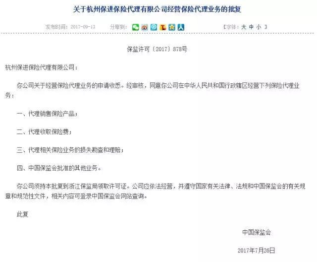 而在9月,蚂蚁金服也已经获批一张保险中介牌照。保监会官网公布信息,同意杭州保进保险代理有限公司经营保险代理业务。保进保险代理成立于2016年9月,注册资本5000万元,注册地为杭州,公司唯一股东为蚂蚁金服,法人代表为蚂蚁金服副总裁、保险事业群总裁尹铭。