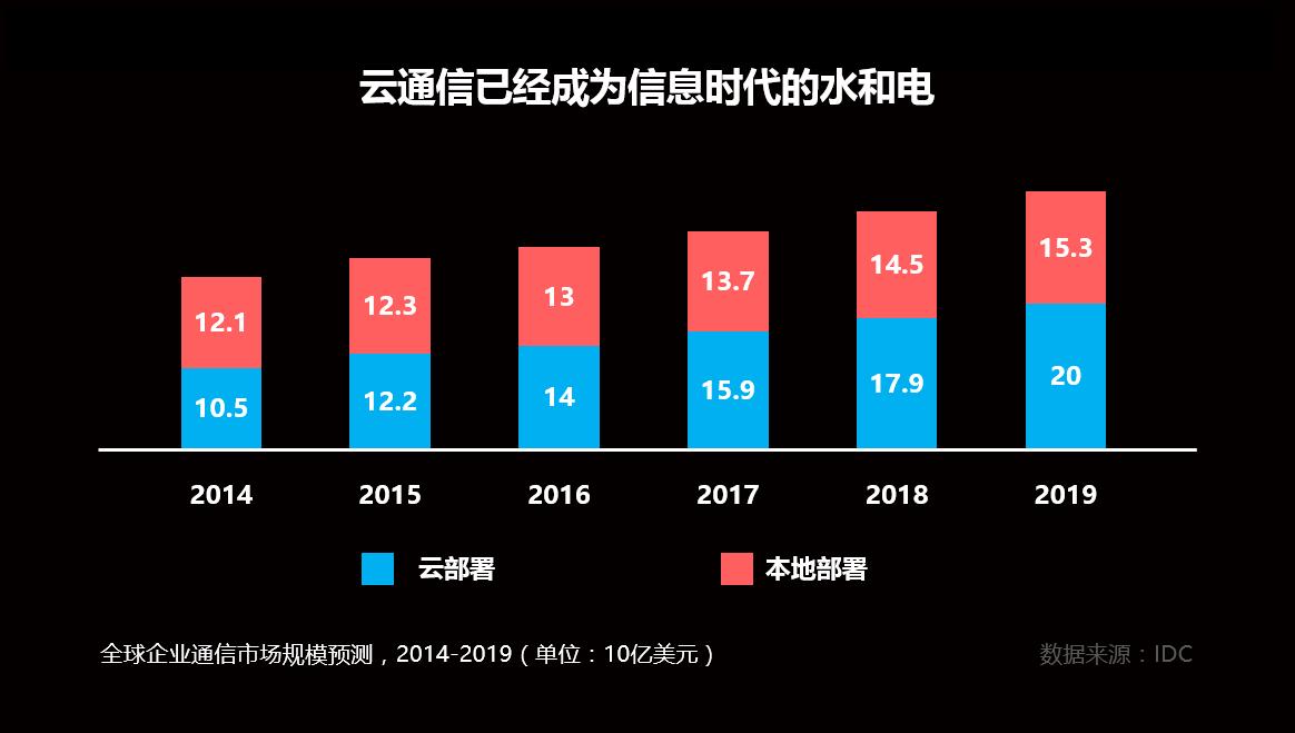 据通信世界网报道,大众通信总经理、玖云平台创始人郑波认为,云通信平台能提供三类运营商无法提供的功能。一是记录企业用户的通话行为、录音,以做好后续的大数据分析。二是满足企业多元化的通信需求,比如隐藏交易双方真实号码,点击呼叫、网页回呼等。三是云通信能解决跨运营商、跨地域互联互通问题。阿里通信总经理余鹏武认为,云通信已经成为信息时代的水和电。根据IDC预测,到2019年,全球云通信市场规模将达到200亿美金,复合增长率是传统企业通信市场的三倍。今年中国云通信市场规模有望突破100亿人民币。