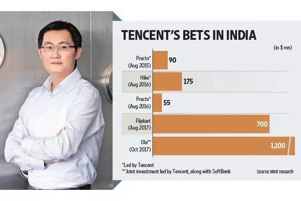 到目前为止,腾讯在印度互联网市场已经投资了15亿美元,其中包括7亿美元投资了 Flipkart。腾讯在印度的第一笔投资是在2015年,当时它花9000万美元投资了一家数字健康平台 Practo Technologies。另外,腾讯还投资了印度通讯应用 Hike。