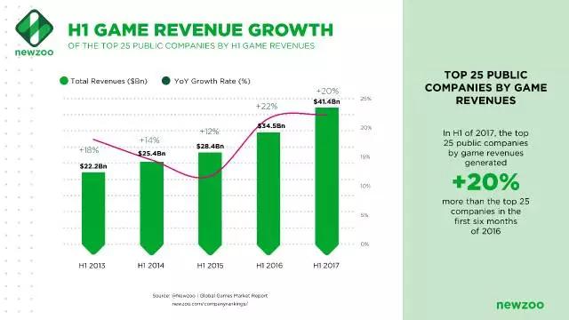 这20家企业的游戏收入在2017年上半年达到393.43亿美元。Newzoo在其报告中称:“前10家企业的游戏收入为314亿元,同比增加24%”这些数据似乎能够说明,游戏产业在整体上仍处于上升期,存在着一定的提升空间。