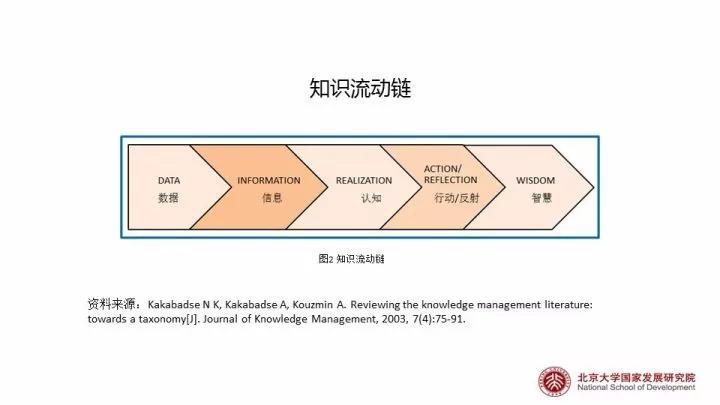 智慧是一个知识流。形成智慧的知识流动链,先有数据,是一个未加工的、客观的事实;数据经过加工,变成信息;再加以鉴别,才成为知识;把知识应用到行动当中,就会变为智慧,智慧是知识应用之后才产生。如果你的知识不去应用,你是不会有智慧的。智慧完全是一个应用的过程。