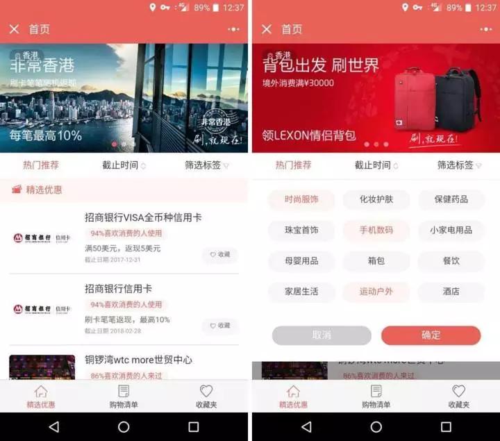 一打开「非常香港优惠券」,首先看到的就是招商银行信用卡及 Visa,为我们准备的香港购物精选优惠。