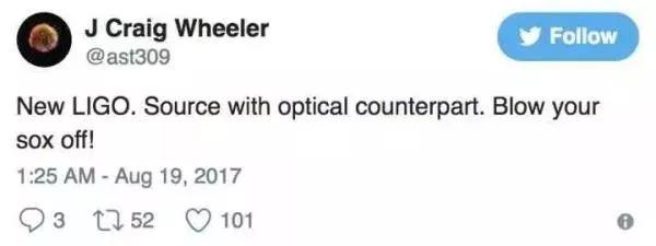 在这场正式的新闻发布会之前,已有小道消息不胫而走,许多蛛丝马迹让人浮想联翩。今年8月19日,国外社交网站推特上,德克萨斯大学奥斯丁分校的J. Craig Wheeler曾跳出来激动地说:“LIGO新发现:引力波源自带光学对应体。惊呆!”(原文:New LIGO.Source with optical counterpart.Blow your sox off!)