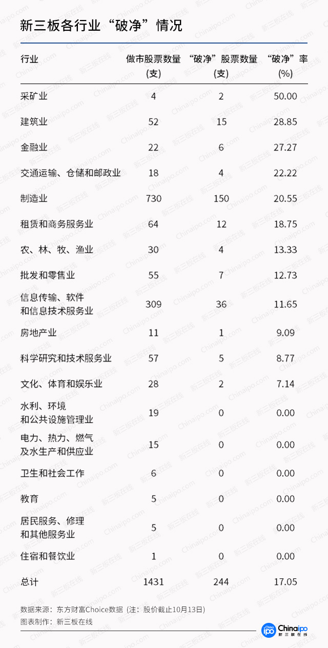 新三板在线统计获悉,截至10月13日,新三板市场共有1431只做市股票。以10月13日收盘价统计,上述1431只做市股票中,244只股票跌破每股净资产。也就是差不多每6只做市股票当中就有1只“破净股”。