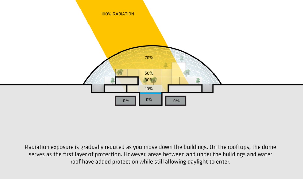 此外据调查,平均来说,每人每天都需要在自然光下呆 109 分钟左右。因此,给予居民自然光,无论是在地球还是火星都很重要。这在建筑当中也要有所体现,既保证不受高温和辐射的伤害,还要保证足够的日光照射。