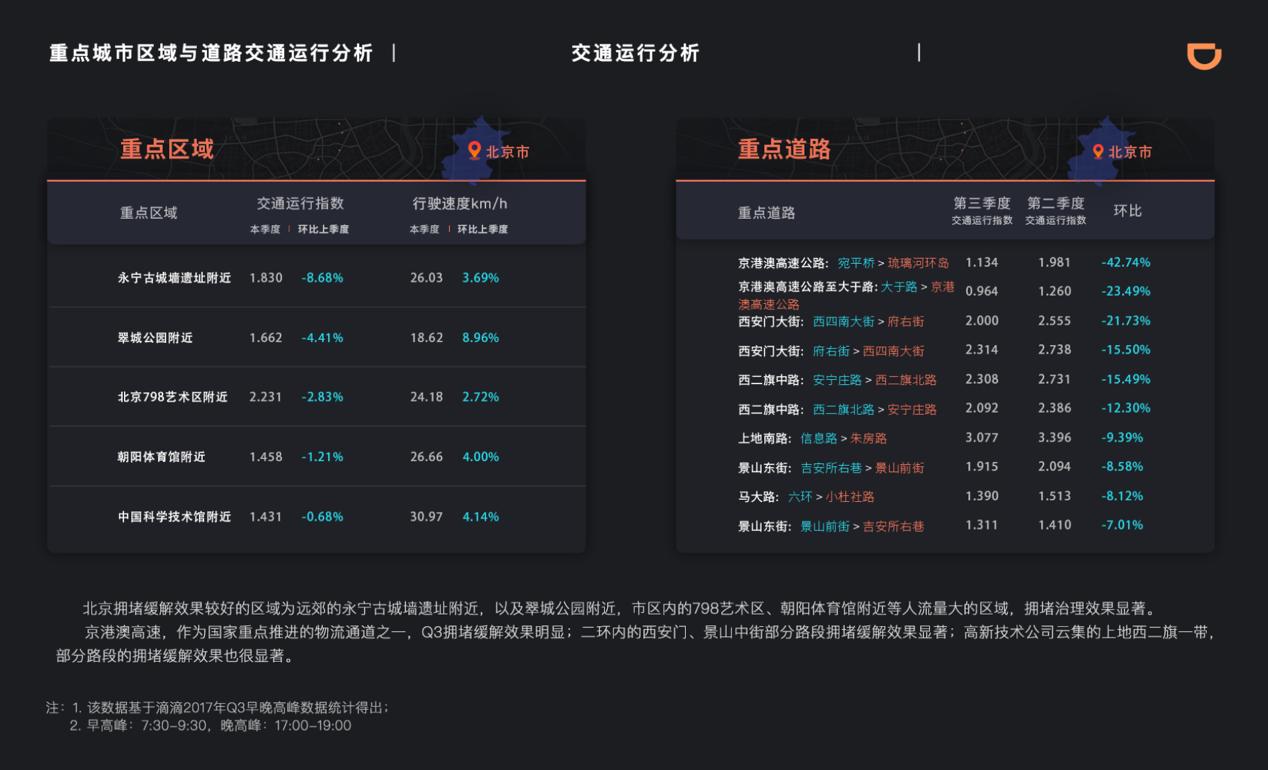 北京拥堵缓解效果最好的区域为永宁古城墙遗址附近,TTI(交通运行指数)环比下降8.68%,京港澳高速作为国家重点推进的物流通道之一,第三季度拥堵缓解效果最为明显;在上海,远郊的兴梅路尚乐坊等地拥堵改善效果较好,市区中吴中路指标下降最快;广州改善效果最好的区域是吕田镇政府附近,最好的路段是工业大道中段和北段,TTI环比下降20%;深圳治堵最有效的区域集中在购物旅游场所,美食街香蜜湖路也成效显著。
