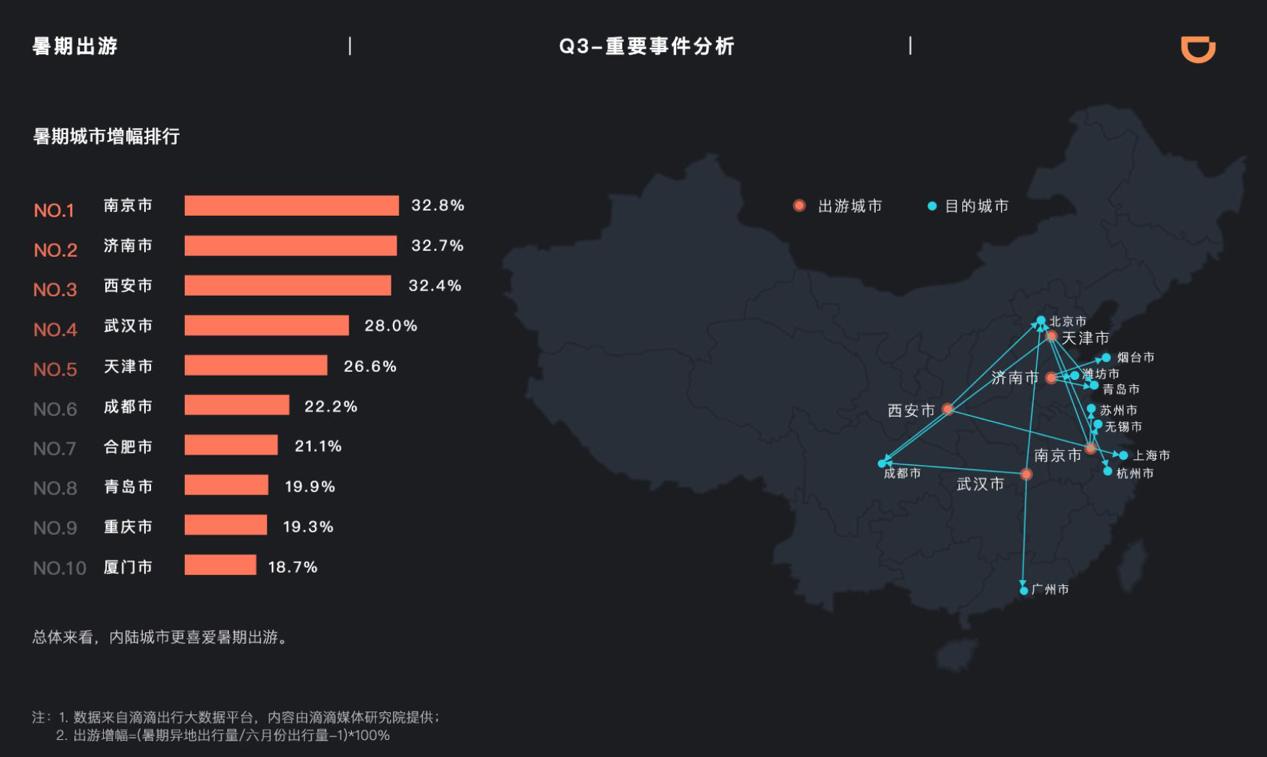 暑期出游季中7月第2周和8月第3周为出游高峰,南京、济南和西安人最爱出去玩儿,旅游城市中青岛、大连和南京的出行增幅最高。北京天安门广场是暑期最热门的景点,成都锦里是夜间最热的景点。在乘顺风车出游中,因当地公共交通资源有限,拉萨、兰州、银川这些西部城市成为涨幅最大的城市。在各大高校中,最受欢迎的高校是浙江大学,其游客多来自于宁波、温州等周边城市。