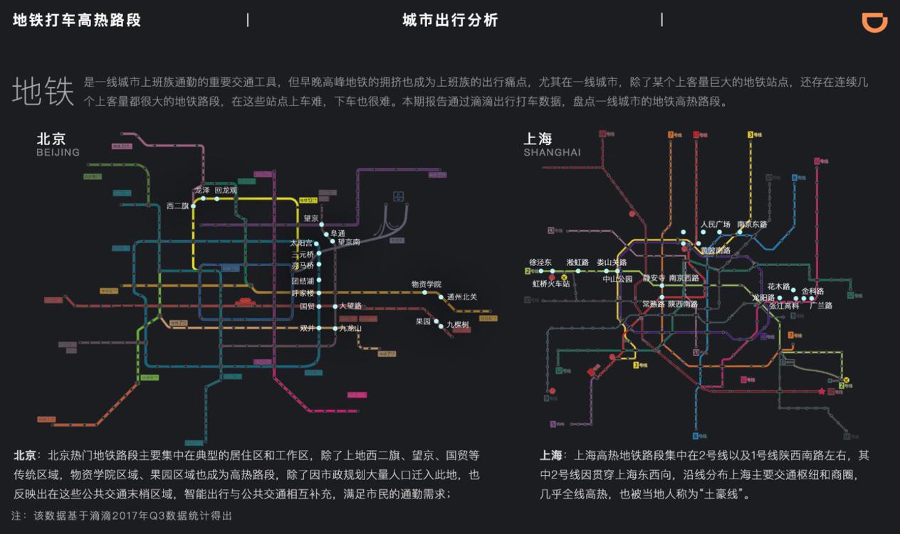 在北京,13号线的西二旗-回龙观、10号线的太阳宫-呼家楼、通州物资学院区域、果园区域客流量较大,这些路段除了上班区和住宅区集中地,还有地铁的末梢区域,凸显出智能出行与公共交通互相补充的特点。上海的高热地铁路线比较集中,主要为2号线和1号线陕西南路左右,其中2号线因为连接主要商圈和交通枢纽,也被当地人成为“土豪线”。