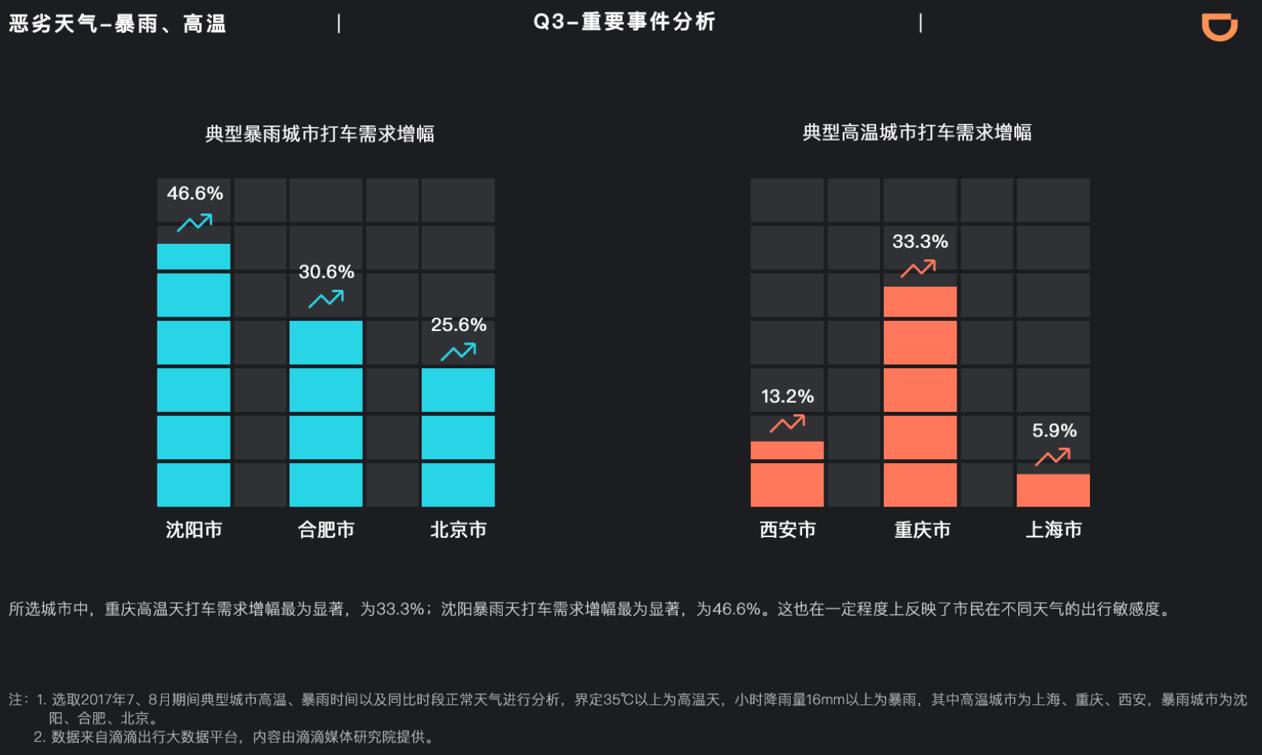 夏天是高温和暴雨频发的季节,天气对出行会带来哪些影响呢?《报告》指出,暴雨天打车需求量上升34.3%,拼车需求上升10%,在所分析的城市中沈阳市增幅最高,为46.6%;高温天打车需求上升17.4%,拼车上升52%,重庆市上升幅度为33.3%。人们在极端天气下更依赖网约车,刚需出行场景如公交地铁站、住宅小区打车需求增加最快,而餐饮、酒店等弹性场景的打车增幅降低。