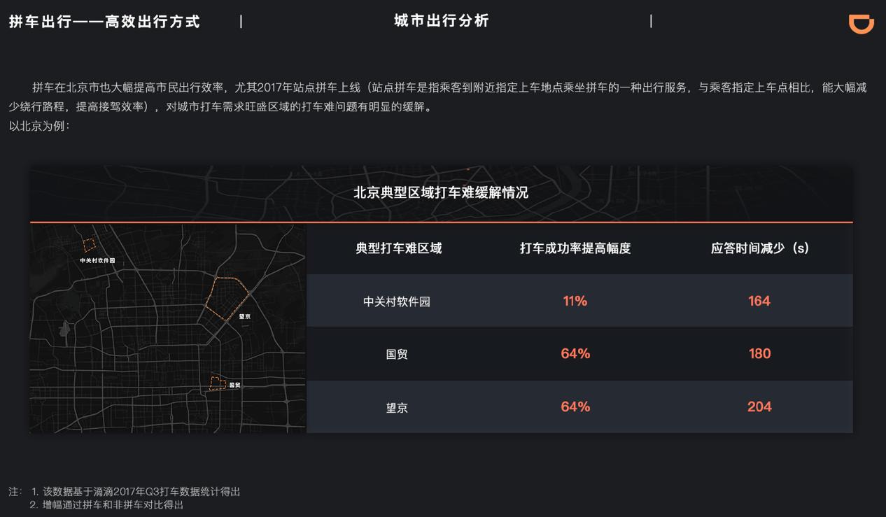 拼车可大幅度提高市民出行效率,尤其是站点拼车上线后,对打车需求旺盛区域有明显缓解。根据浙江大学交通工程研究所的研究,拼车对整个城市交通系统会产生较大正收益,在需求高峰时段拼车与非拼车相比,可使所有车辆的单位行程载客量提高27%。在最难打车排名第3的上海,外滩、陆家嘴、虹桥火车站、黄浦体育馆是最难打车的地区,但如果选择拼车,可提升陆家嘴地区打车成功率152%,平均每次打车应答时间快25秒;在北京国贸,拼车使打车成功率提高64%,应答时间减少180秒。