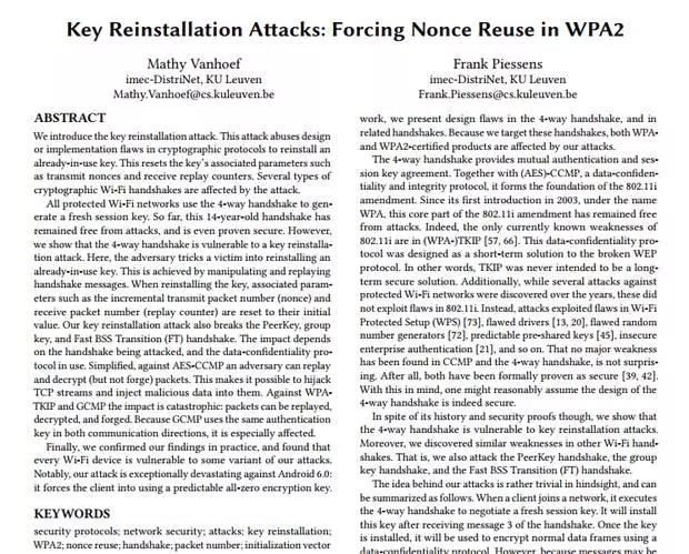 Wi-Fi 安全性出现漏洞,是比利时鲁汶大学安全研究员 Mathy Vanhoef 近日在他的论文里指出的问题。
