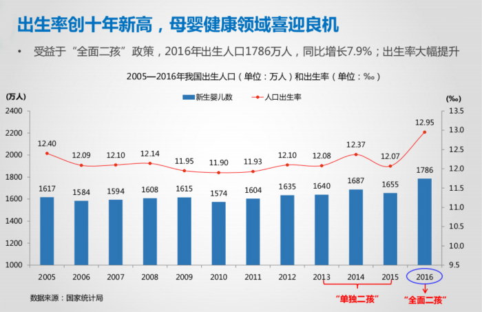 不可否认的是,从必要性来看,月子期间母婴护理服务是国民经济转型升级过程中提升产妇生活质量的刚需产品,受益于“全面二孩”政策,国家统计局数据,2016年出生人口1786万人,同比增长7.9%,出生率大幅提升,母婴健康领域喜迎良机。