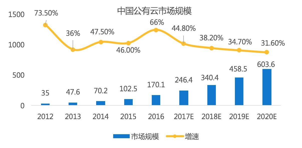 2016年我国公有云市场整体规模约为170.1亿元人民币,较2015年增加了66%,2015年云计算市场规模约为102亿元人名币。预计2017 - 2020年中国公有云市场仍将保持高速增长,到 2020 年市场规模将达到603.6亿元。