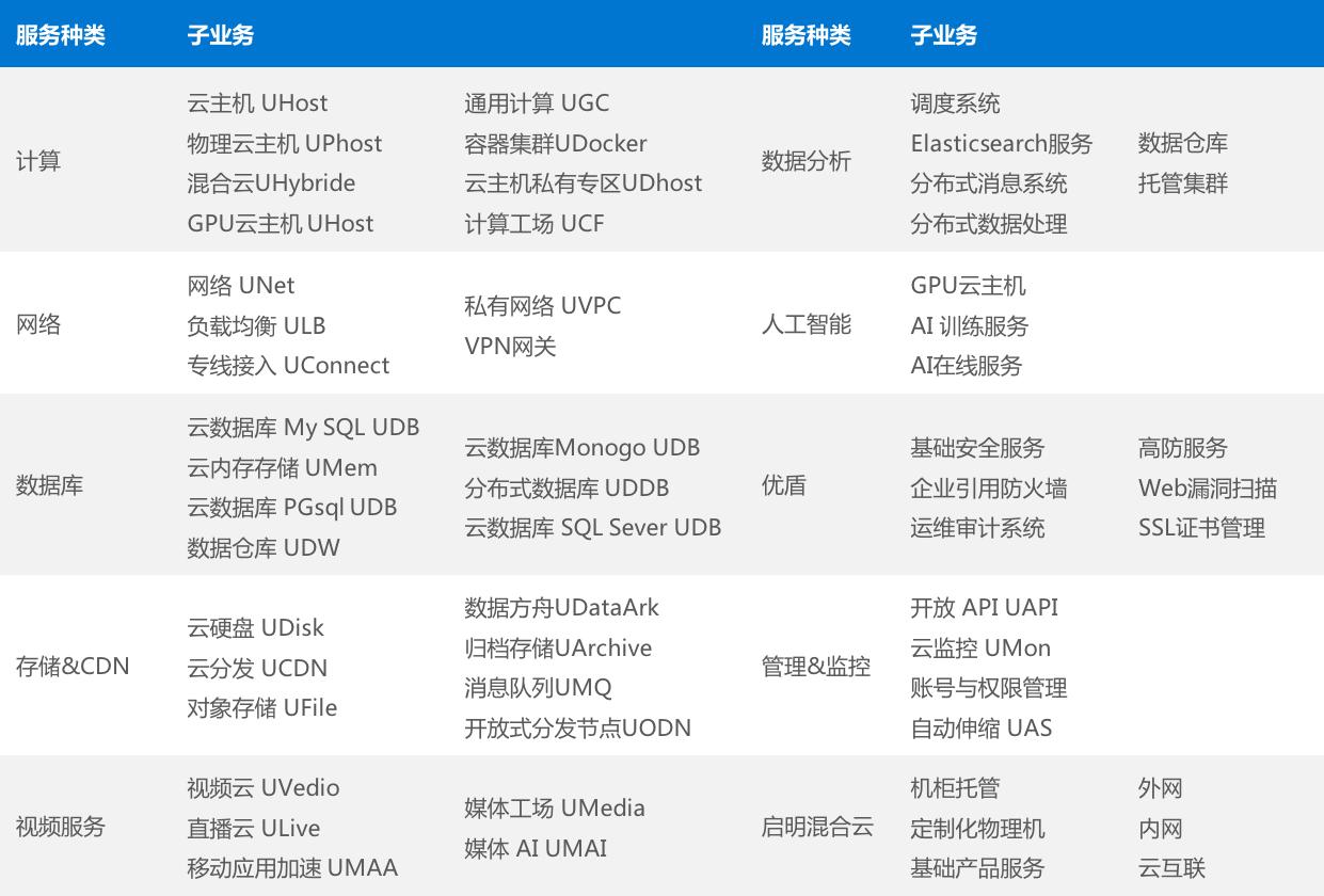 如前文所述,IaaS层中包含了服务器、虚拟化、网络和存储等四个业务环节,而UCloud目前的主要收入来源于其提供的计算、存储、CDN等几类服务,下文我们将结合以上两点对该企业的主要业务进行介绍。