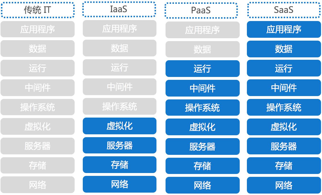 如上文所述,云计算公司是为企业提供 IT 服务,从IaaS到PaaS再到SaaS三种不同的服务内容。下图是云计算中所包含的业务环节以及不同服务模式之间的区别。图中将 IT 服务分为9个环节,灰色部分表示该环节需要由企业管理,蓝色部分表示该环节由云计算公司提供。