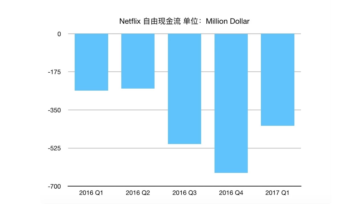 据Netflix首席内容官Ted Sarandos透露,预计到2018年,公司将推出80部原创电影,这也就意味着每个月会产出6部-7部电影,这个数量相当可怕,投入的规模也可想而知。由于Netflix的盈利手段有限,目前主要靠会员费,高额的制作成本无疑会为经营带来巨大的压力,根据Netflix的财报,公司的自由现金流一直都为负,第三季度的现金流同比有所减缓,但仍然为-4.65亿美元。