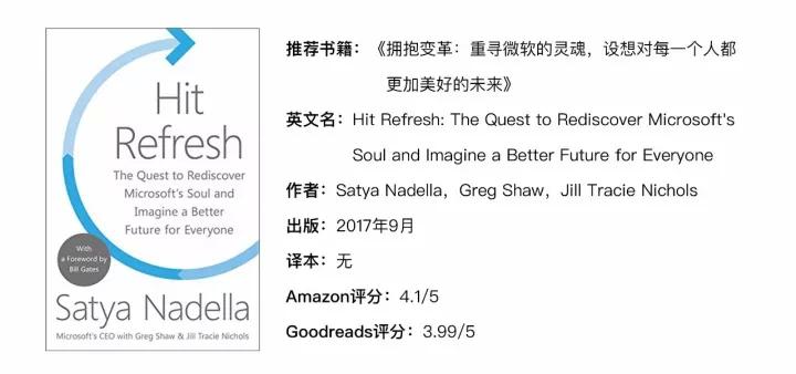 2017 年 9 月 26 日,纳德拉出版了一本新书,《拥抱变革:重寻微软的灵魂,设想对每一个人都更加美好的未来(Hit Refresh: The Quest to Rediscover Microsoft's Soul and Imagine a Better Future for Everyone)》。