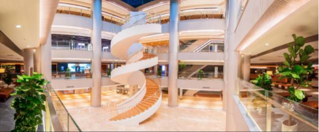 目前该商业已完成将零售面积改造为办公面积的转型,内部空间摒弃了传统商场的格子式格局,设计了中庭、玻璃幕墙和挑高的空间,内部有美食、运动、休闲生活等。