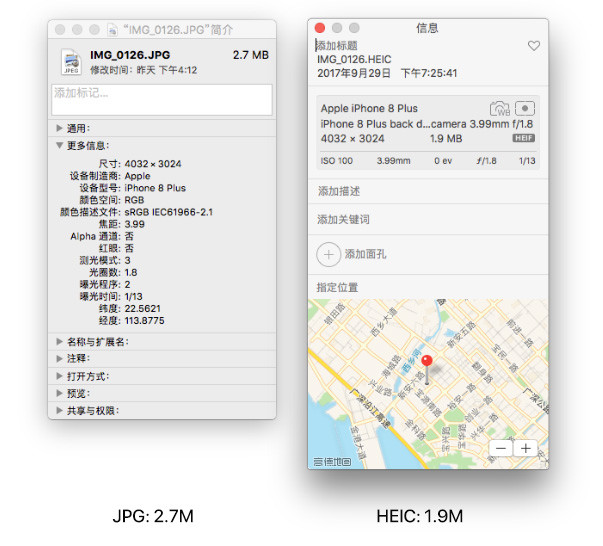 通过对比系统相册中的 HEIF 格式图片和通过 AirDrop 导出的 JPG 图片,可以发现新格式下图片大小压缩了 30% 左右。