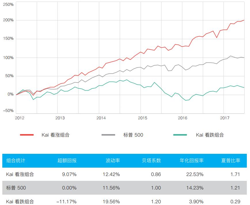 1)机器人分析师“Kai”,基于市场公开信息,预测股票价格中长期趋势的人工智能模型。通过实时分析400多个指标与未来回报间的关系,评估公司状况。技术上的核心能力,一是数据的采集、清洗和整理,二是算法和建模能力。“Kai” 会抓取传统金融行业外大量非结构化的的文本数据(如新闻、社交、媒体、贴吧、股吧),利用自然语义处理、情感分析,结合金融数据(实时价格和各种信号),预测股价。目前,“Kai”覆盖美股、A股,在两国股市均获得较稳定的超额收益(见下图)。