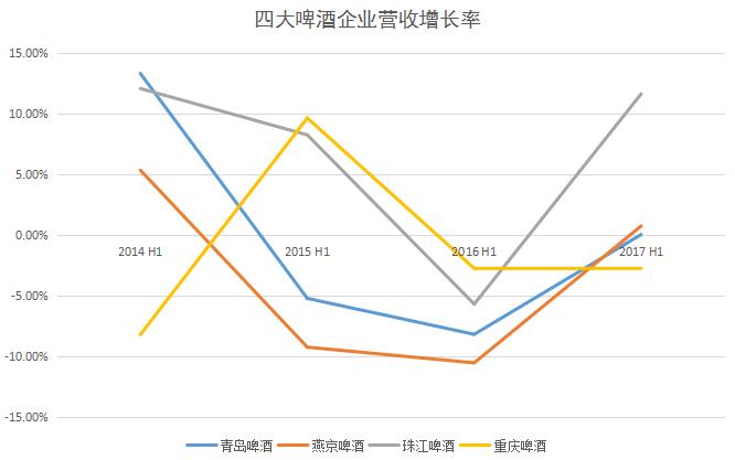 2014年至2016年间,啤酒整体产量曾连续下滑25个月,各大啤酒品牌的营收增长也在2016年上半年触底,从过去动辄10%以上正增长变成了10%的负增长。