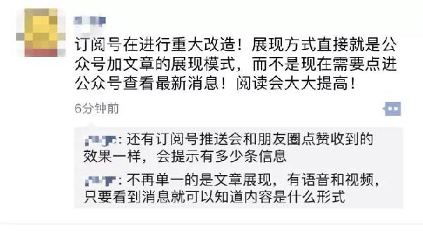 近日,在网上流传着这样一张朋友圈截图,上面赫然写着“订阅号在进行重大改造!展现方式直接就是公众号加文章的展现模式,而不是现在需要点进公众号查看最新消息!阅读量会大大提高!”