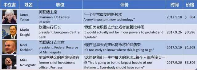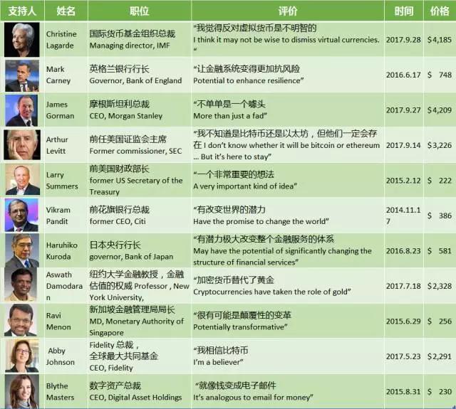 笔者特此收集金融界名人们近年来对比特币的公开评价。 从这些评价可以看出,比特币依然是争论的焦点, 各方势均力敌。然而,近期比特币价格的强势,也许会让一些像戴蒙这样的怀疑者再次思考:比特币是否仅仅是泡沫,也许应该用更加开放的心态来了解这个新生事物。