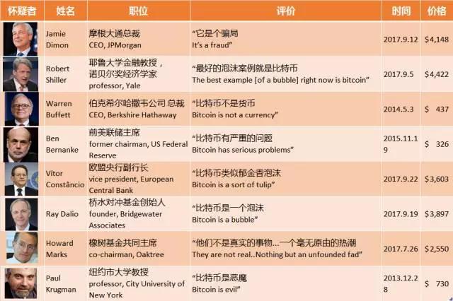 浏览这些"讣告", 你会惊奇地发现, 唱衰比特币的人群里有众多大家熟悉的金融名人,比如巴菲特;有学术界权威,比如诺贝尔经济学奖获得者罗伯特.席勒;还有金融监管高层,如前美联储主席本.伯南克。