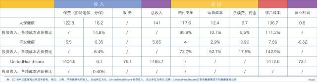 对比联合健康保险业务与人保健康、平安健康的收支结构可以发现,国内两家健康险公司综合成本率仍有提升空间。