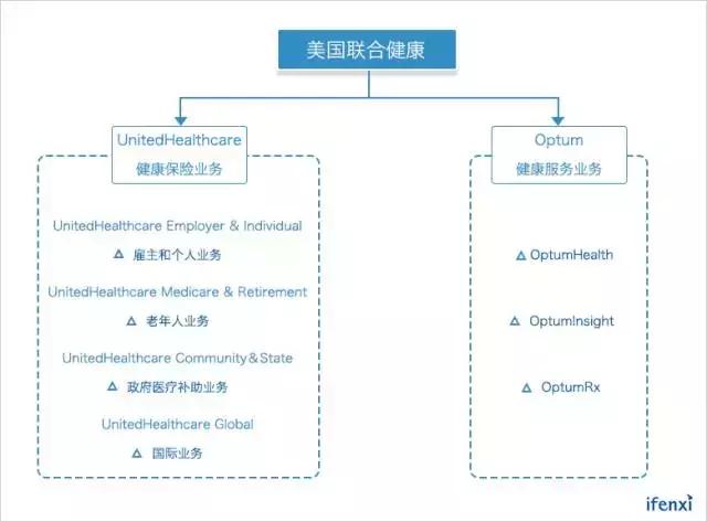 联合健康旗下分为健康保险、健康服务两大业务群,彼此独立,却又紧密配合。健康保险服务于企业员工、个人、政府计划中的老年人、低收入群体;健康服务承担健康、医疗、护理等职责,既能满足保险业务的服务需求,也能单独获客,服务保险体系外用户。