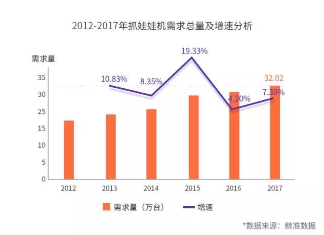 有多少热闹的商业点位,就有多少繁荣的娃娃机。据不完全统计,商业综合体在2013年之后的5年时间内迎来新一轮开发供应期。目前国内商业综合体项目约有近800个,其中仅万达一家,截至2016年12月底开业项目已经有186个,2017年计划开业项目50个。所以自2013年开始我们注意到,诸多城市的新建影院、商业综合体,甚至是地铁站,都成为抓娃娃机经营者们争抢最激烈的点位。“根据我们的统计,过去几年每年都有二、三十万台的增长,目前全国的抓娃娃机总量已经超过130万台。”一位业内人士称。