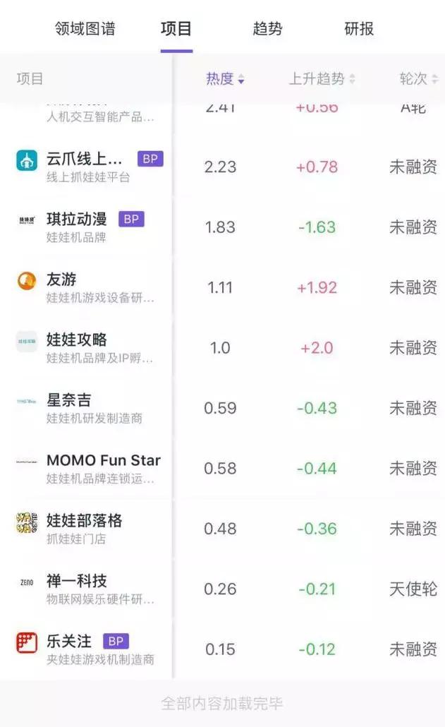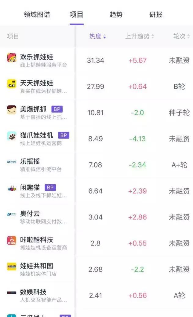 目前排名前三的项目,美爆抓抓获得了500万人民币的种子轮投资,天天抓娃娃已经进入B轮,而以欢乐抓娃娃目前的热度来看,颇受资本关注,应该近期就会有融资的消息放出,而其他的项目,未融资的占绝大多数。