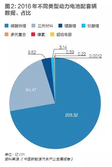 国内的动力电池以磷酸铁锂电池和三元电池为主,其中磷酸铁锂主要供应客车,三元电池主要供应中高端乘用车。新能源客车此前引领了国内新能源汽车的发展,因此,铁锂电池是当前国内电池产能的主力。中国汽车技术研究中心的数据显示,2016年中国生产的新能源汽车中,磷酸铁锂电池总配套量为203.32亿Wh,占比72.26%,其中的72%供应给纯电动客车;三元电池总配套量为64.47亿Wh,占比22.91%,其中的73%供应给纯电动乘用车。