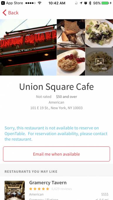 联合广场咖啡馆未使用OpenTable预订方式,但该平台仍显示其搜索结果