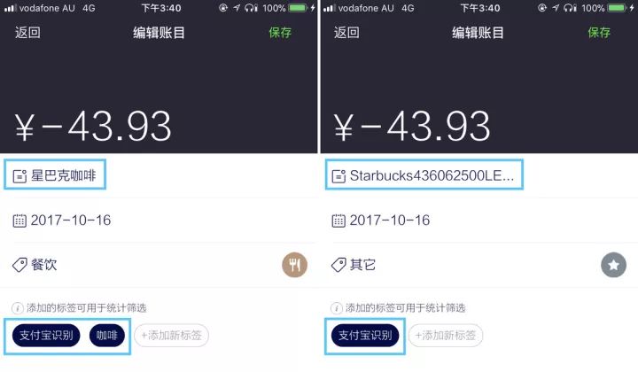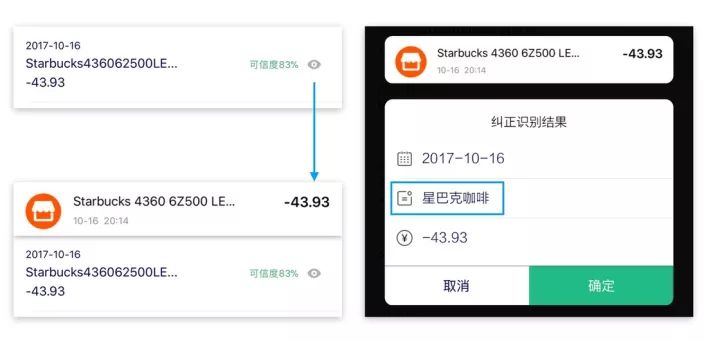 在这种情况下,你可以在识别出结果的时候通过点按小眼睛的图标与原截图进行对比,并修改备注。比如在我将 Starbucks 改为星巴克咖啡后,该笔交易就被自动识别成了餐饮,并打上了咖啡的标签。