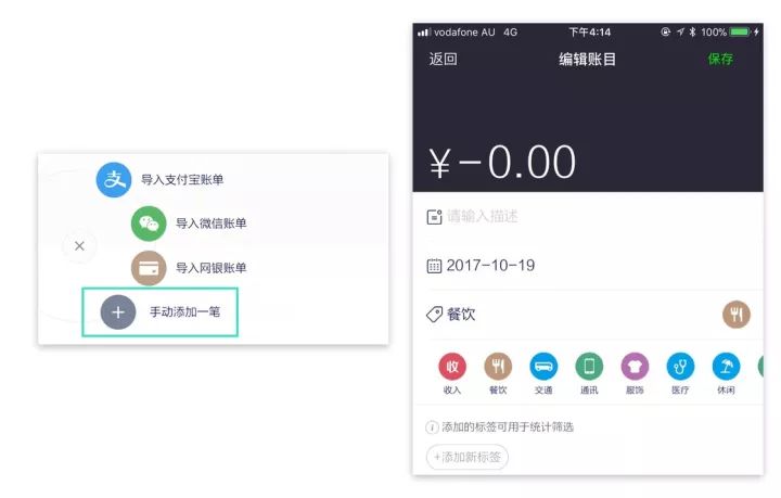 与自动识别的可选项目一样,除了金额和时间之外,你能记录的还有分类、标签和描述。