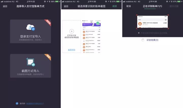 支付宝的截图识别操作与微信一样,同样都是先截图之后再跳转回神奇账本。