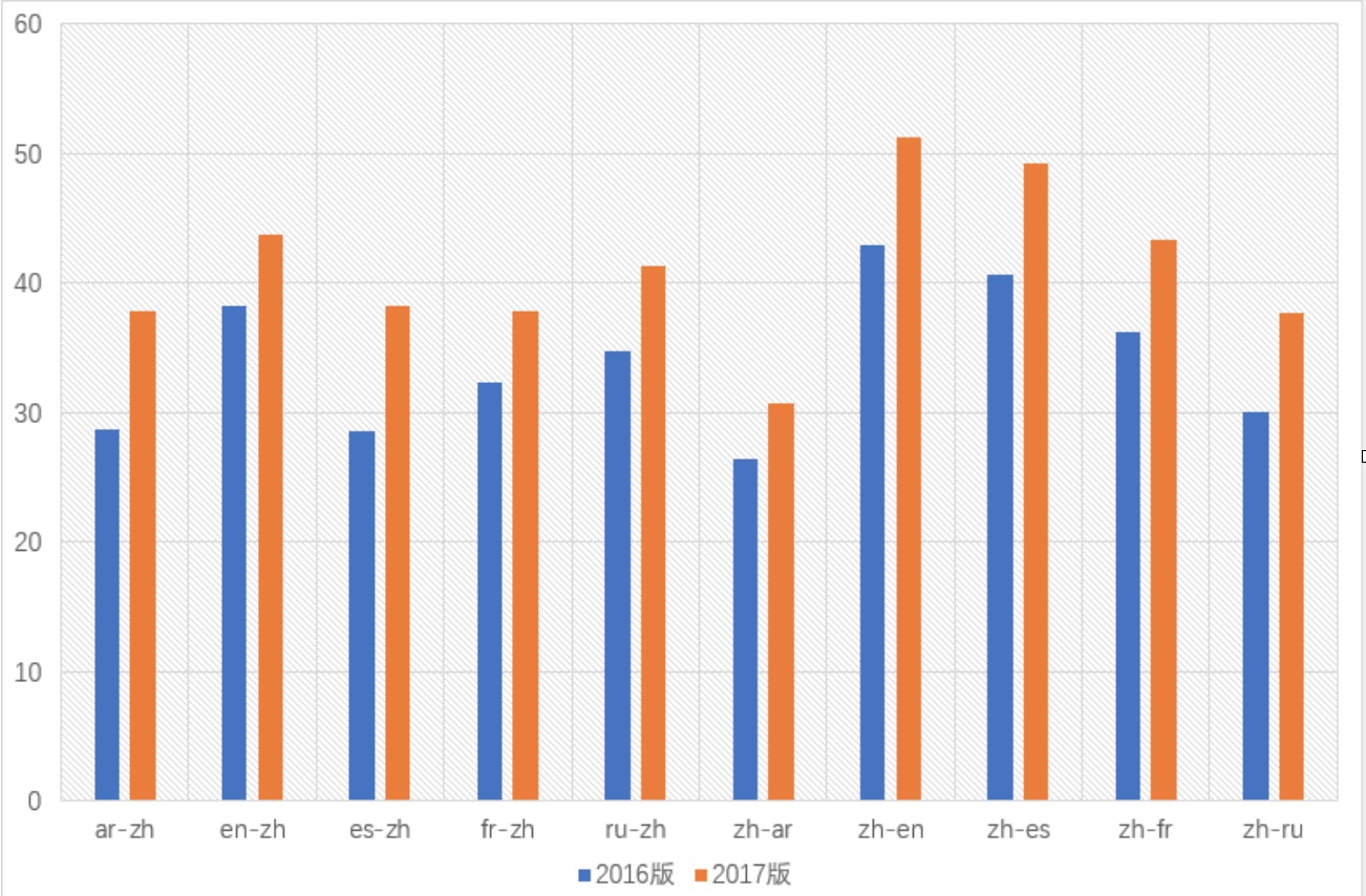 36氪了解到,新译科技自2015年起至今,从最初的规则统计混合模型,到现在的神经网络模型,主要更新了三版系统。为了检验公开线上的翻译效果(mt.newtranx.com),新译科技使用公开的联合国领域内数据(United Nations Parallel Corpus v1.0)(http://www.lrec-conf.org/proceedings/lrec2016/pdf/1195_Paper.pdf )以及 UM-Corpus(http://nlp2ct.cis.umac.mo/um-corpus/ )做了评测。其中公开的 United Nations Parallel Corpus v1.0 为1990年到2014年的数据,新译科技选择了所有的外语到中文的双语数据(英中、法中、西班牙中、阿拉伯语中、俄语中文),另外补充了2015-2016年的联合国双语数据每个语言对大约30万句以及 UM-Corpus 的210万句英中双语数据。测试集合选择 United Nations Parallel Corpus v1.0 中的公开测试集合开发集。下图给出了以 BELU 值(国际上常用的一个机器翻译评测标准)作为评测指标的对比图。从图中可看出最新版系统翻译质量较上一版本基本都达到了2个BLEU值的提升,最高提升9个百分点。