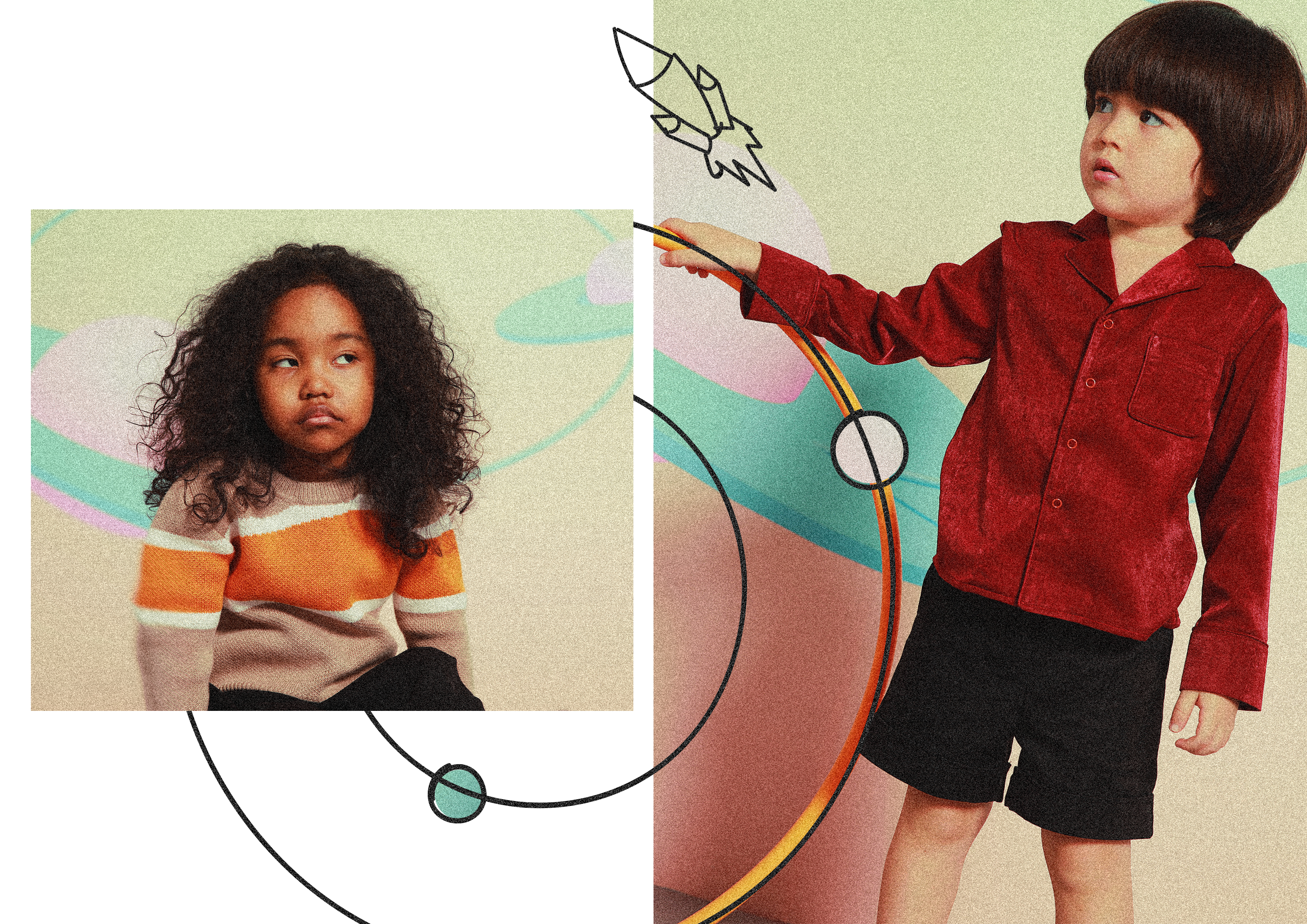 “潮二代”的服装并非成人潮服的打样缩小,除了款式之外,在一些细节上也需要根据儿童的成长特征和实际需求进行调整,做到可穿性和设计感的平衡。举个例子,一款儿童西装裤,可以以松紧腰的形式来制作,方便穿脱,但 COOIII 的选择是将前腰设计为西装版型的腰头,后半部分则采用了部分松紧带和调节纽扣的形式,在满足穿脱的便捷性的同时也能保证美感。